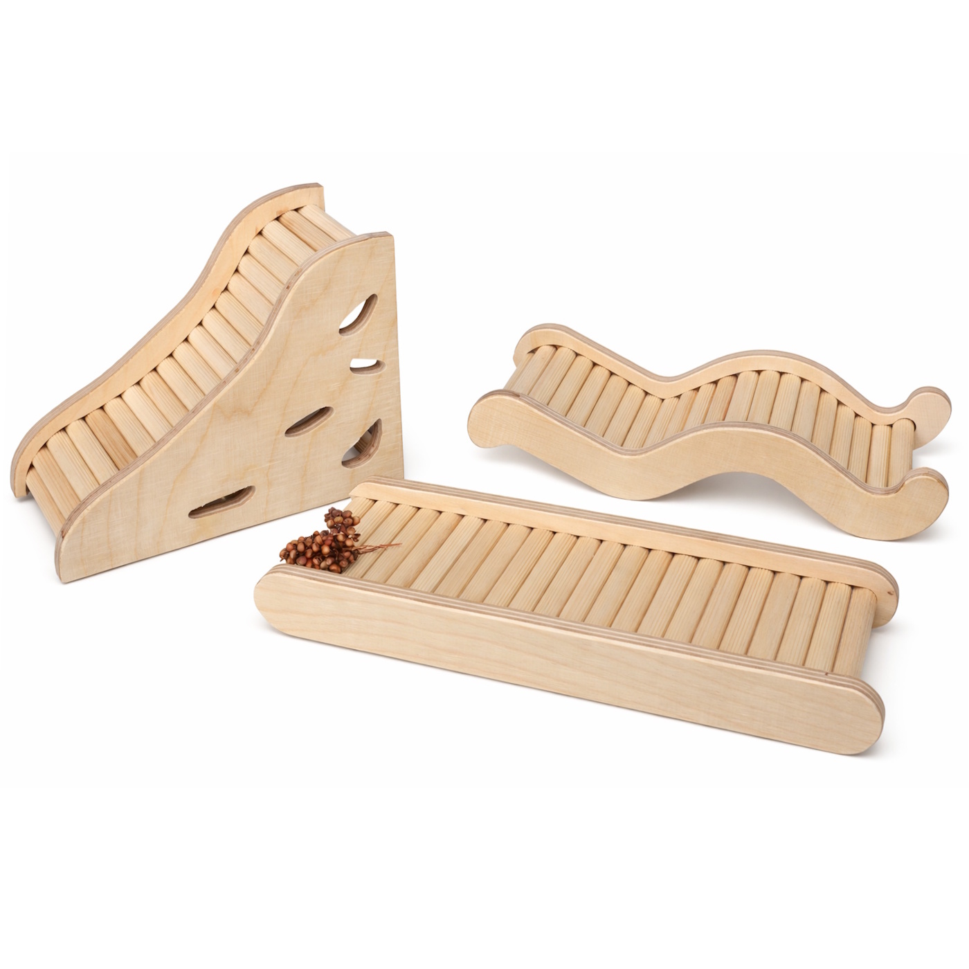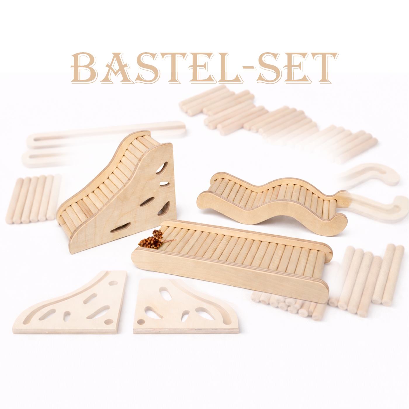 Mit diesem Set bastelst Du ganz einfach drei verschiedene, praktische Leitern und Rampen für Dein Hamstergehege. Sie helfen Deinem Liebling beim sicheren Aufstieg auf Häuschen und Etagen und eignen sich auch perfekt als Ein- und Ausstieg für Sandbad oder Buddelbox.