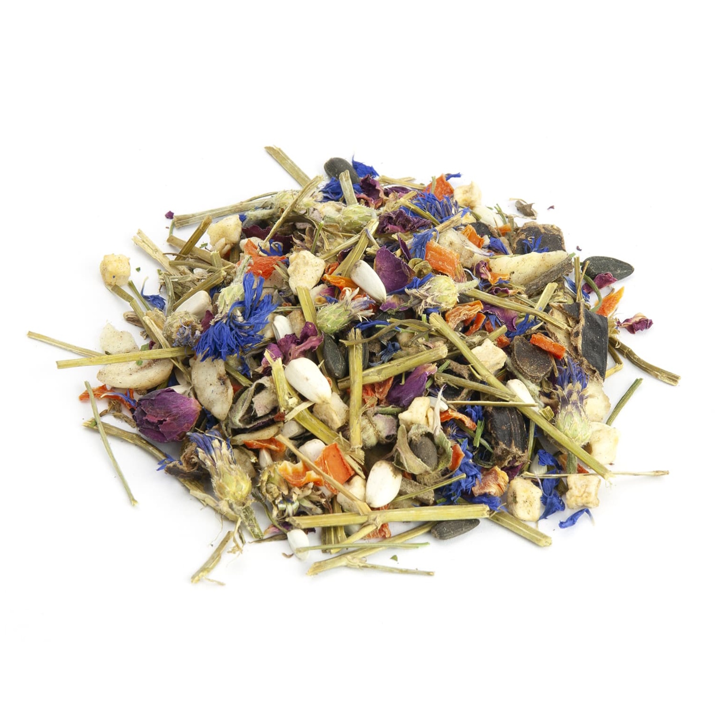 Johannisbrot, Karotten, Bananenchips, Apfelwürfel, Kardisaat, Luzernestängel, Sonnenblumenkerne, Rosenblüten, Kornblumenblüten, Petersilienstängel.