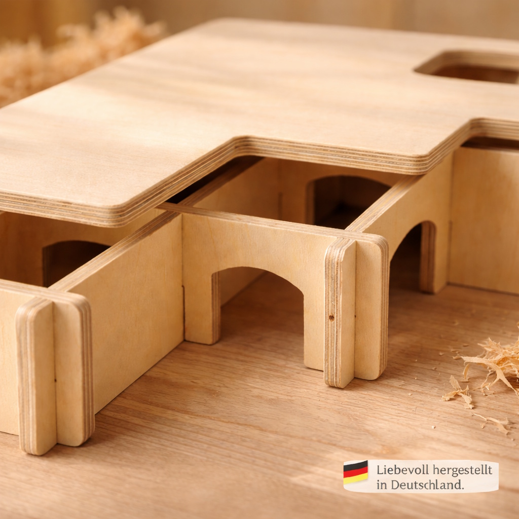 Wir fertigen jedes Haus wird in liebevoller Handarbeit in Deutschland in unserer kleinen Werkstatt. Dabei legen wir besonderen Wert auf Qualität, Langlebigkeit und Tierwohl – für ein Hamsterzuhause, das nicht nur schön aussieht, sondern wirklich durchdacht ist.