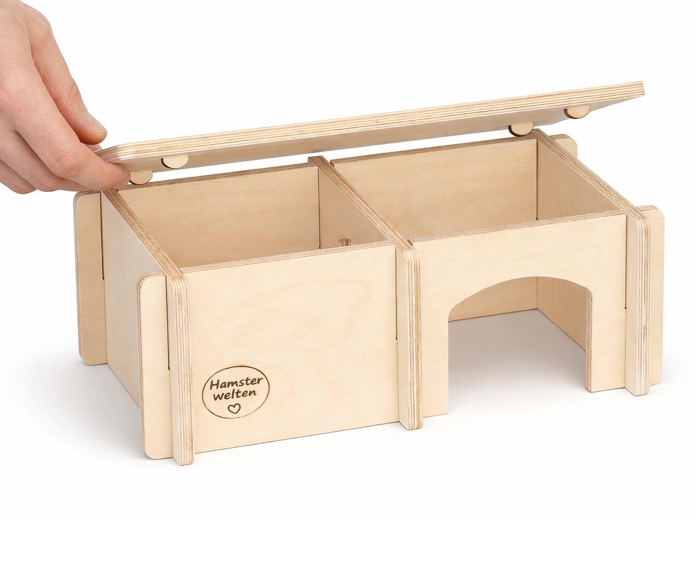Mit dem steckbaren Schlaf- und Spielhaus „Traumdomizil“ schenkst Du Deinem kleinen Liebling ein natürliches Zuhause mit besonders hohem Wohlfühlfaktor. Gefertigt aus hochwertigem Birkenholz bietet dieses Zweikammerhäuschen Hamstern und Mäusen einen geschützten Rückzugsort zum Schlafen, Verstecken und entspannten Erkunden.